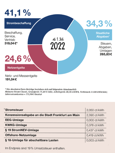 Darunter fallen zum Beispiel die Mehrwert- und Stromsteuer, eine Umlage für die Förderung von Offshore-Windenergie oder ein Aufschlag für die Kraft-Wärme-Kopplung. Mit der Abschaffung der EEG-Umlage zum 1. Juli 2022 ist dieser Anteil leicht gesunken. Diese Preisbestandteile können die Energieversorger nicht beeinflussen, sondern sind verpflichtet, sie voll an die jeweiligen Endkundinnen und -kunden weiterzugeben.